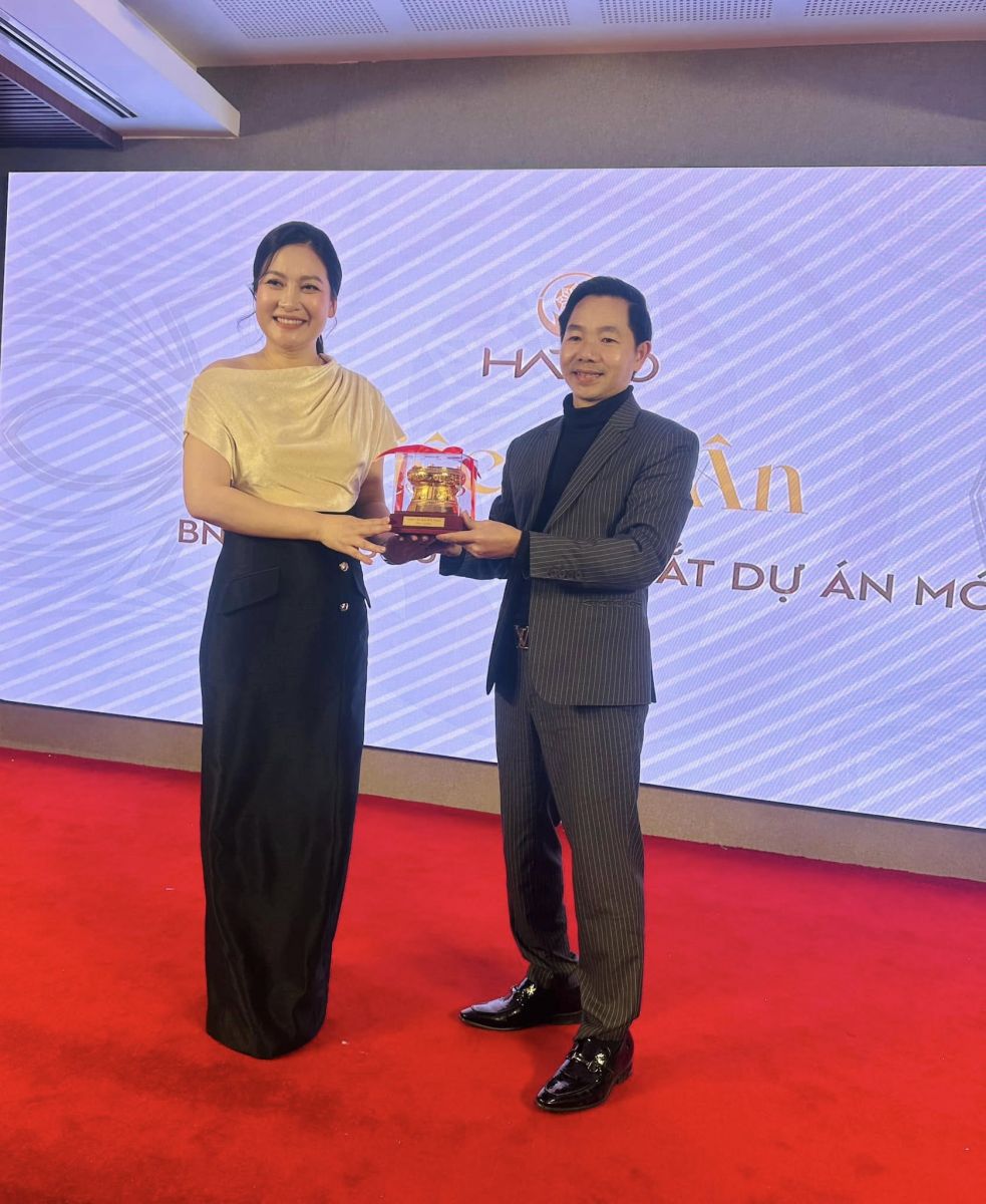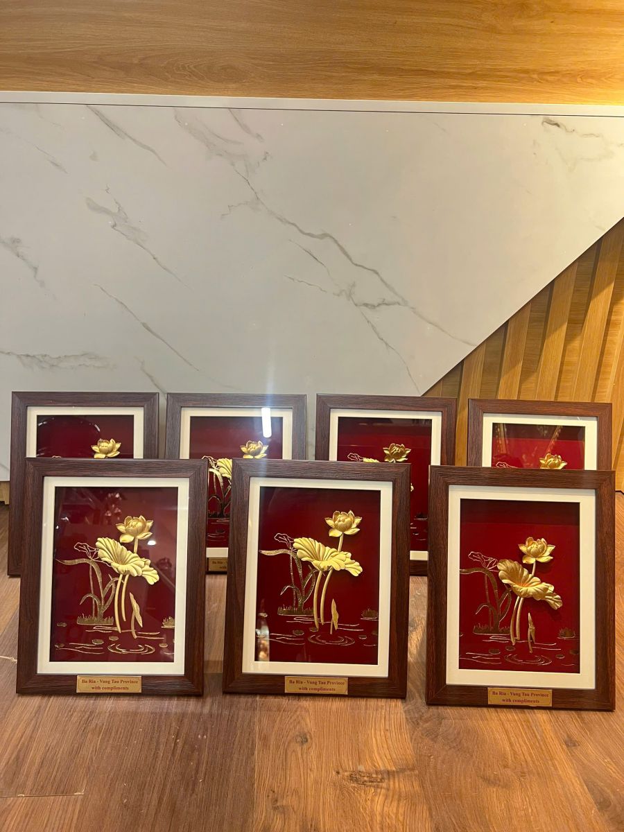 Tranh Hoa Sen Mạ Vàng: Hoa sen là quốc hoa, tượng trưng cho sự thanh cao, bản lĩnh "gần bùn mà chẳng hôi tanh mùi bùn". Bức tranh hoa sen vàng trên nền nhung xanh thẫm tôn vinh vẻ đẹp khí chất và tâm hồn của nữ lãnh đạo: Quyết liệt trên thương trường nhưng vẫn giữ được sự an nhiên trong tâm hồn.