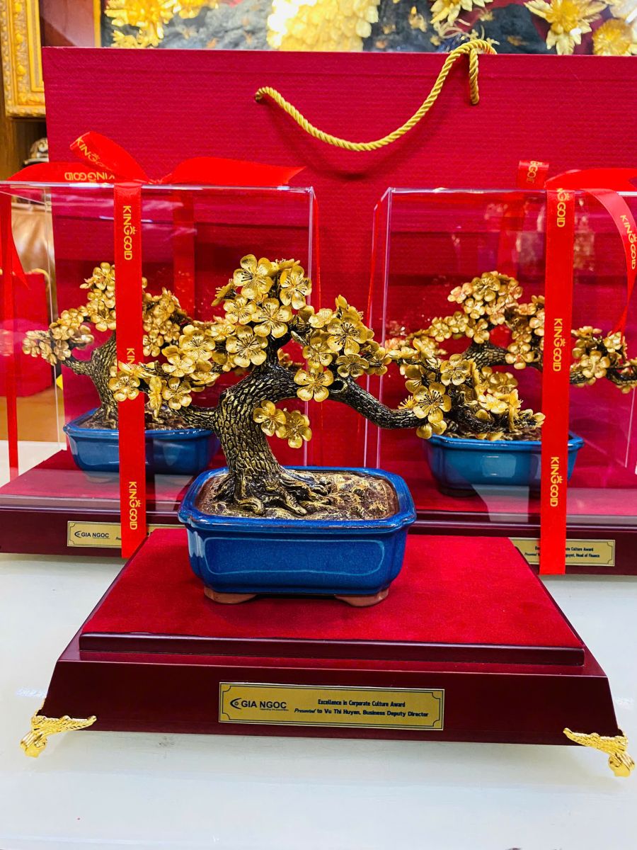 Tính độc bản: Mỗi chậu mai đều có thể được tùy chỉnh theo yêu cầu riêng, gắn logo doanh nghiệp hoặc lời chúc mừng năm mới được chạm khắc tinh tế trên đế gỗ.