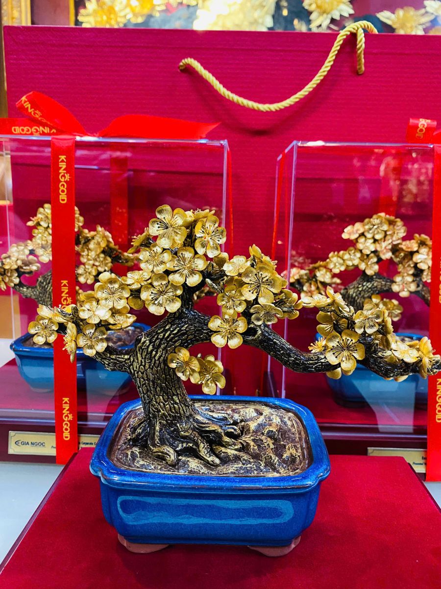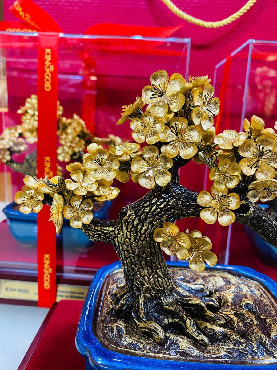 Khác với những nhành mai tươi chóng nở chóng tàn, chậu mai dát vàng mang vẻ đẹp vĩnh cửu, là biểu tượng cho sự thịnh vượng bền lâu, rất phù hợp để làm quà biếu sếp, đối tác hoặc trang trí tại phòng khách, văn phòng lãnh đạo.