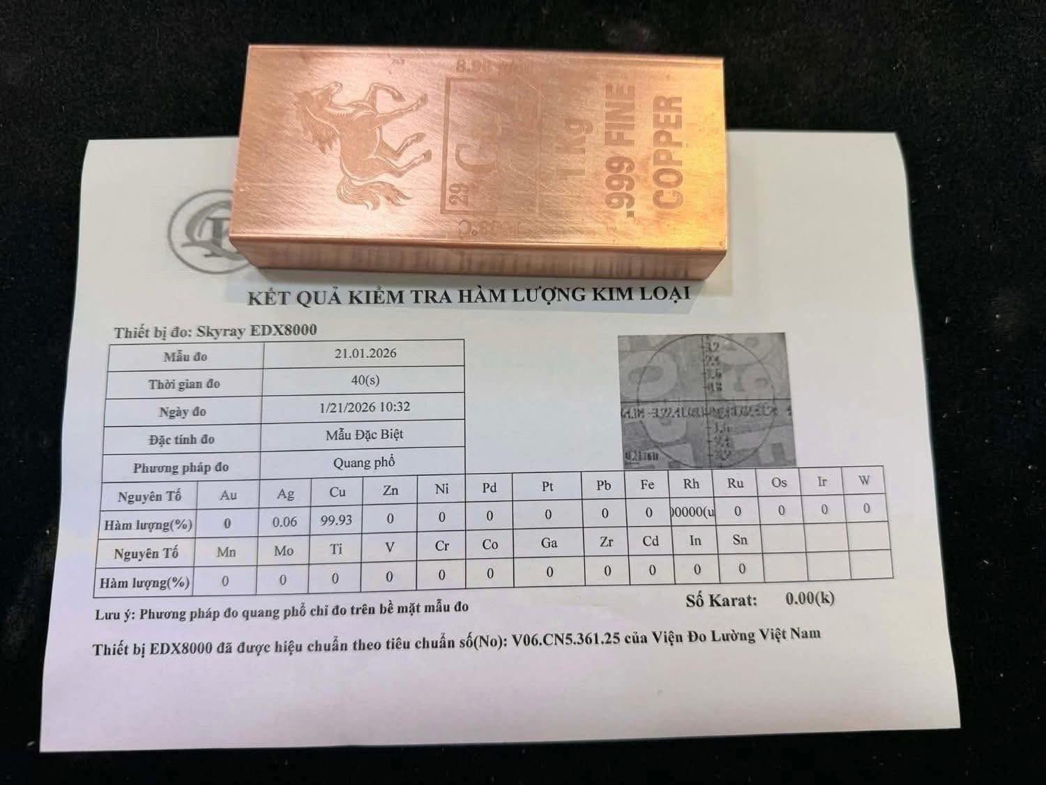 Tất cả các sản phẩm thỏi đồng nguyên chất của King Gold Art đều trải qua quy trình thử nghiệm tại Quatest 1. Kết quả phân tích cho thấy hàm lượng đồng luôn duy trì ở mức cực cao, từ 99,5% đến hơn 99,8%, đảm bảo đúng tiêu chuẩn đồng 999.9 công bố.