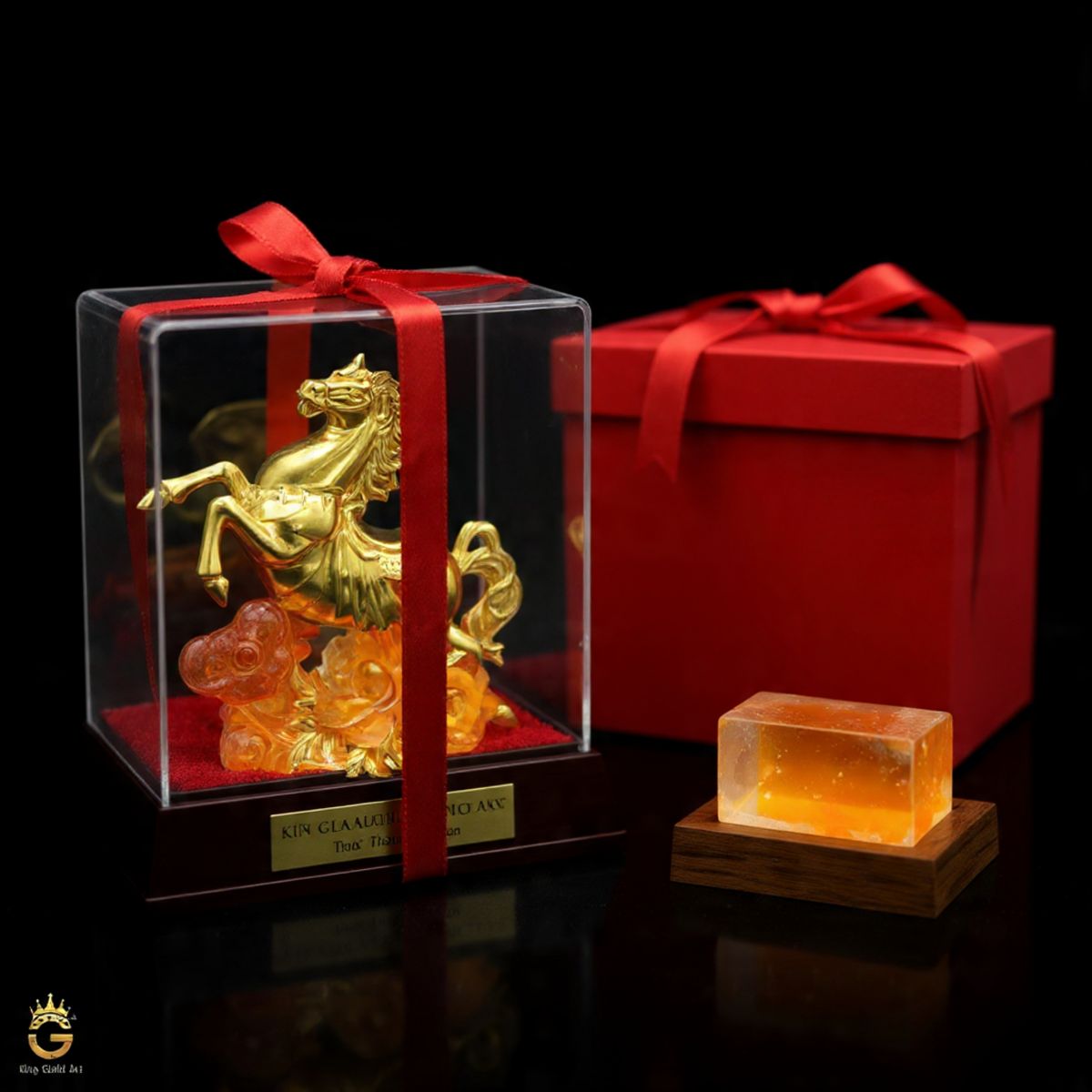 Trong phong thủy phương Đông, ngựa là linh vật đại diện cho tốc độ, ý chí bền bỉ, tinh thần tiên phong và con đường công danh rộng mở. Khi được chế tác bằng vàng 24K và đặt trên nền đá thạch anh cam quý hiếm, tác phẩm Kim Mã Phú Quý – Thạch Anh Tụ Lộc không chỉ là một vật phẩm trang trí, mà còn là biểu tượng của vượng khí, tài lộc và sự thăng hoa trong sự nghiệp. Đây chính là mẫu tượng ngựa mạ vàng 24k cao cấp của King Gold Art, được giới doanh nhân và các tập đoàn lớn lựa chọn làm quà tặng đẳng cấp.
