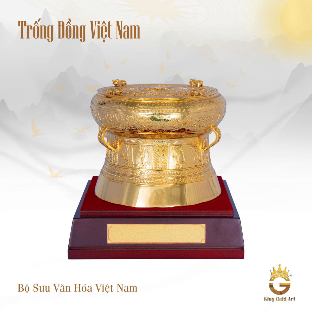 Trống Đồng Mạ Vàng: Biểu tượng của quyền lực và lịch sử. Mặt trống đồng Đông Sơn với các họa tiết nhân sinh quan được tái hiện tỉ mỉ, mạ vàng sáng bóng, đặt trên đế gỗ sang trọng. Đây là món quà tặng ngoại giao cao cấp nhất.