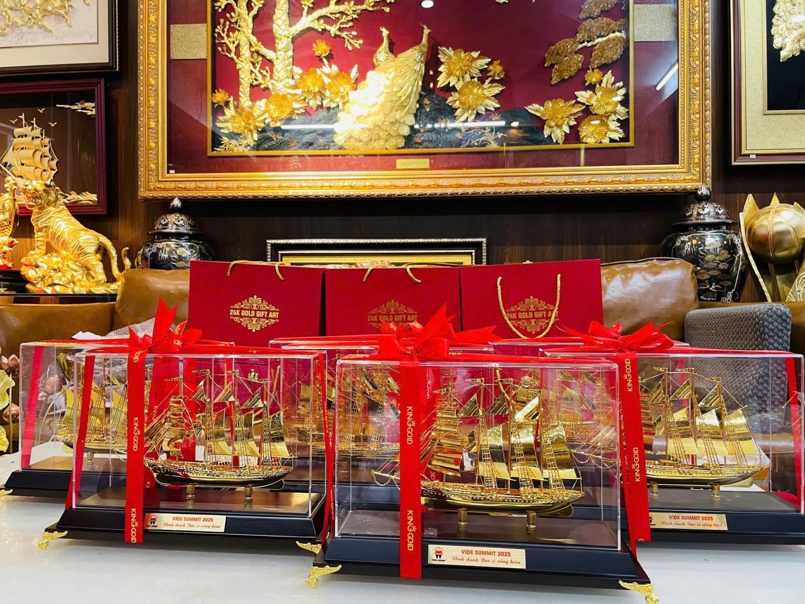 Dự án Mô Hình Thuyền Buồm: Các mô hình thuyền vàng trong tủ kính mica được sản xuất hàng loạt cho các sự kiện vinh danh doanh nhân.