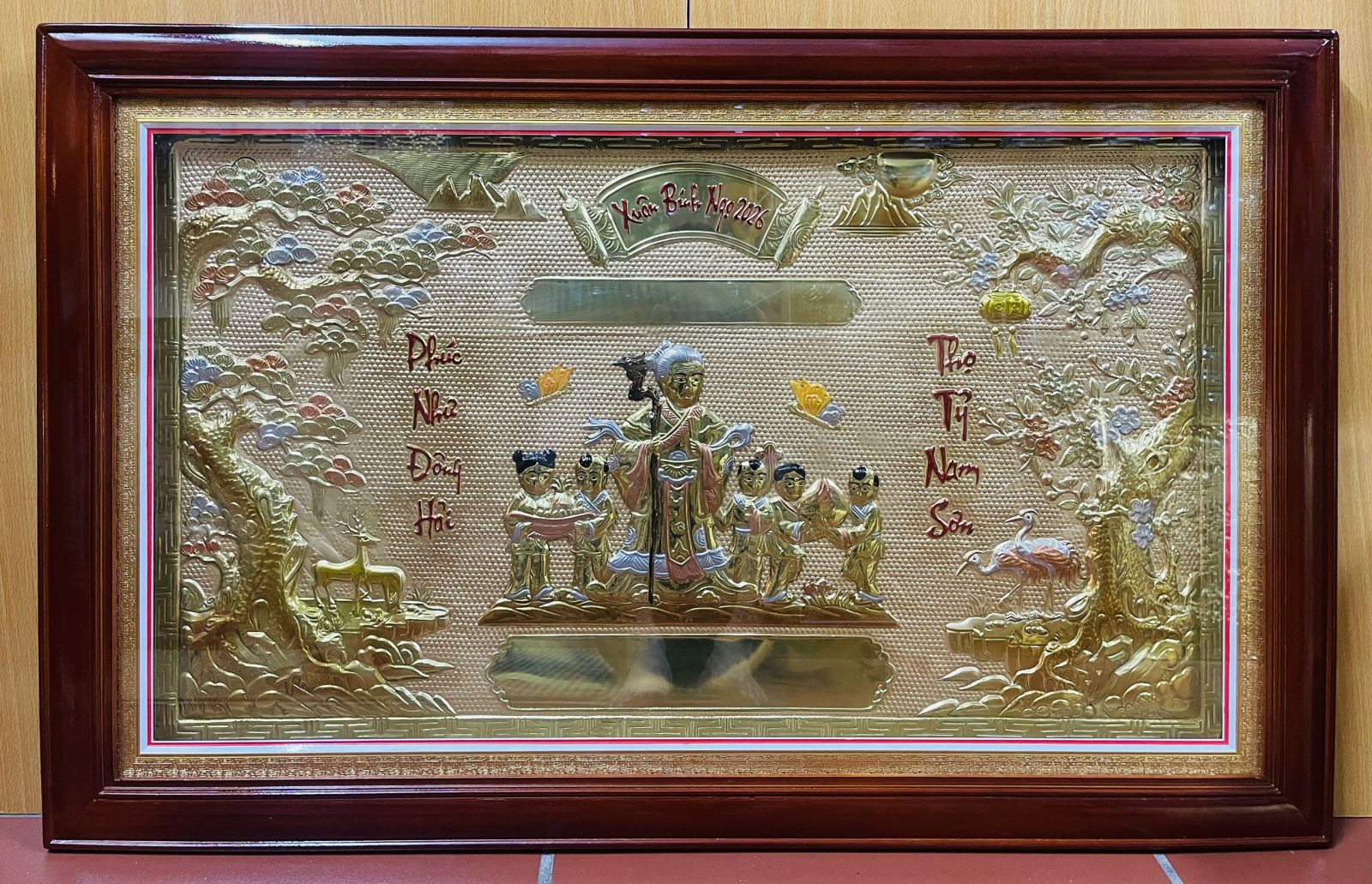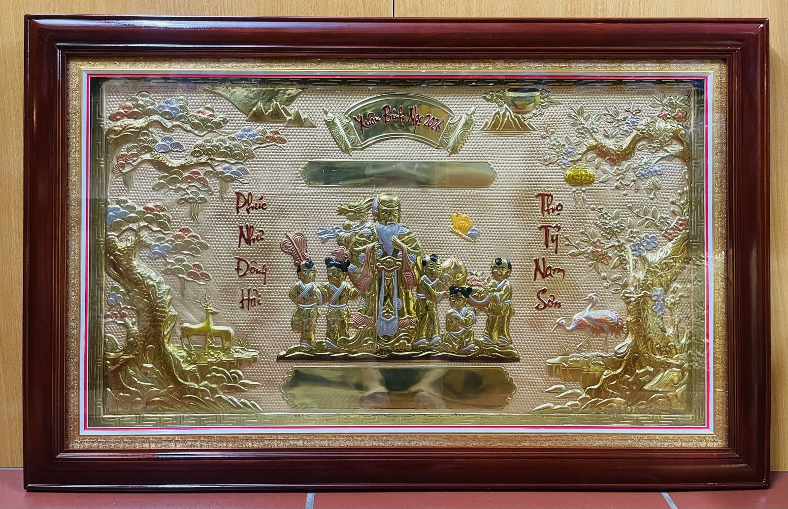Chi tiết đắt giá: Xung quanh ông Thọ là đàn cháu nhỏ đang vui đùa, dâng lễ vật, thể hiện niềm hạnh phúc "Con cháu đầy đàn". Phía trên là cuốn thư khắc rõ dòng chữ "Xuân Bính Ngọ 2026", khẳng định tính thời sự và sự chuẩn bị chu đáo của người tặng.