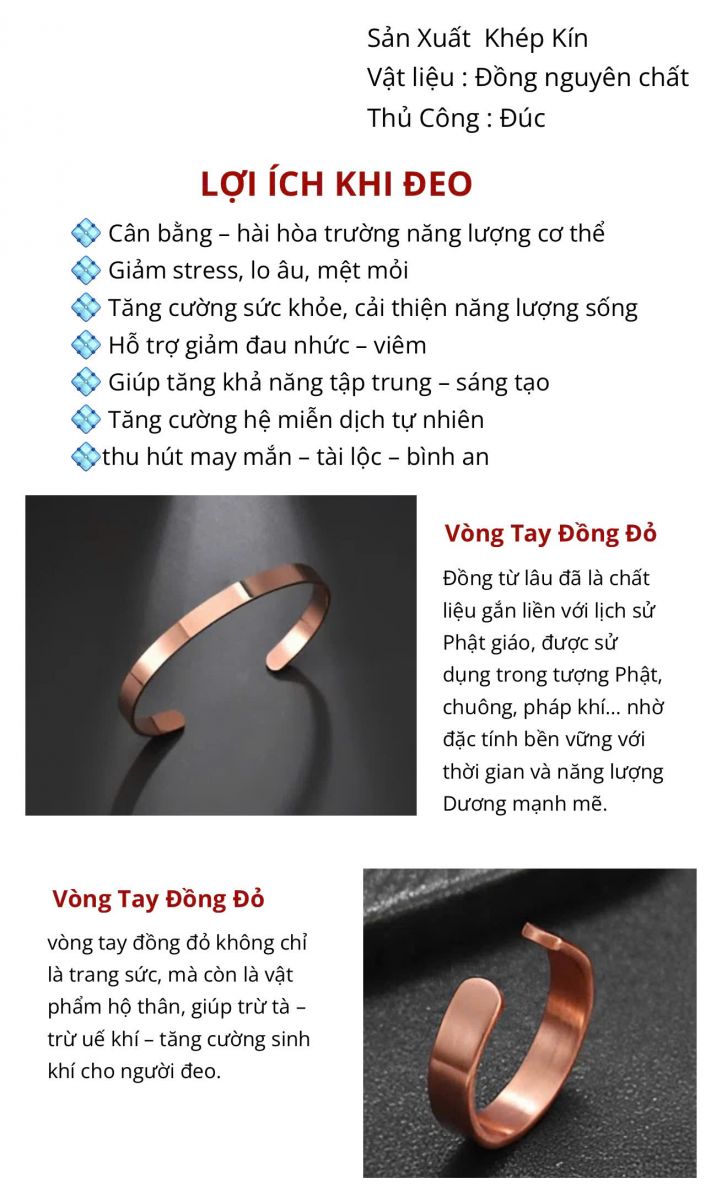 Khác với các hợp kim pha tạp, đồng đỏ nguyên chất giữ được cấu trúc kim loại ổn định và khả năng dẫn năng lượng cao. Từ xa xưa, đồng đỏ đã được tin dùng trong việc cân bằng sinh khí, hỗ trợ lưu thông năng lượng trong cơ thể và môi trường sống. Khi được chế tác thành vòng tay đồng đỏ, kim loại này tiếp xúc trực tiếp với da, giúp người đeo cảm nhận rõ rệt sự hài hòa và dễ chịu trong sinh hoạt hằng ngày.